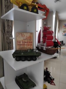 Открыл цикл выставок мастер из сл. Красюковской Большенко В.В. , который делает модели различной техники: военная техника, строительные машины, корабли, макеты домов….Мастер работает с картоном и мелким бросовым материалом. Делится своим мастерством с ребятами из красюковских школ. Ведет кружок по доп образованию «Едем, плаваем, летаем»