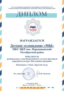 В этом году ЦКР п.Персиановский принял активное участие в этом фестивале. По итогам регионального этапа Всероссийского детского фестиваля народной культуры «Наследники традиций». Целых 3 наших работы прошли в федеральный этап. Поздравляем ребят и их руководителей! Цыганкова Милена в номинации Фольклор. Ее руководители Афанасенко Н.В. и Романова Е.В. Куприкова Анастасия в номинации декоративно- прикладное творчество. Ее руководитель Рубачева Е.А. И коллектив детского телевидения «МЫ» под руководством Клепиной А.Н.
