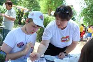 Яровенко Т.М. провела для детей и гостей фестиваля мастер класс «Цветная манка» в технике насыпка. Ребята ушли с яркими летними рисунками.