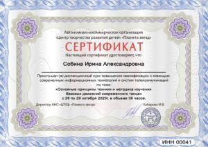 Проходить курсы, посещать семинары, повышать квалификацию, значит расти и развиваться. Это очень важно для преподавателя по танцам. Собина Ирина Александровна прошла курсы повышения квалификации по теме «Основные принципы техники и методика изучения базовых движений современного танца» с 26.10.2020 по 29.10.2020 в объеме 36 часов и получила сертификат.