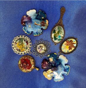 Екатерина Сергеевна рассказала участникам мероприятия, что смола включает в себя высокие декоративные качества. Этот материал дает проявить фантазию и реализовать творческий потенциал. Данные кулоны были сделаны на металлической основе. Участники использовали для создания рисунка сухоцветы, полудрагоценные камни и стразы.