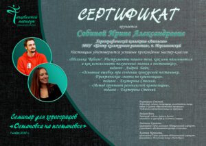 7 ноября 2020 Собина Ирина Александровна посетила онлайн-семинар для хореографов «Остановка на постановке». Семинар состоял из нескольких мастер-классов известных педагогов-хореографов: