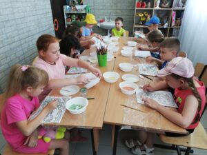 Руководитель студии дикоративно-прикладного искусства Татьяна Яровенко подготовила и провела для ребят мастер- класс по аппликации цветной манной крупой «Летние фантазии».Татьяна Михайловна познакомила присутствующих с нетрадиционной техникой рисования манной крупой. Участники мастер-класса освоили три способа рисования: рисование на подносе, клеевое, крашеной манкой. Данный вид рисования завораживает своей простотой и оригинальностью.  Под руководством Татьяны Михайловны ребята с помощью манки смогли изобразить целые картины, изображающие самые летние развлечения . Работы получились яркими, красочными.