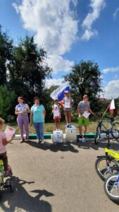 В заключение состоялось награждение победителей велостартов, которыми стали: Миронова Мария – 1 место, Миронова Анастасия -2 место, Голушко Семён – 3 место. Приз зрительский симпатий завоевали самые маленькие участники соревнований – Вислогузова Аня и Довбня Георгий, которые получили от ЦКР мягкие игрушки.