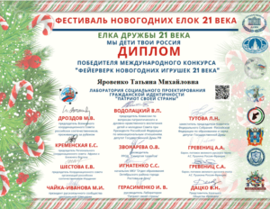 В  декабре  Татьяна  Михайловна  Яровенко  приняла  участие  в   Фестивале  новогодних  ёлок  21  века.  За  представленную  работу  Татьяна  Михайловна  получила  Диплом  победителя международного  конкурса  «Фейерверк  новогодних  игрушек 21  века».