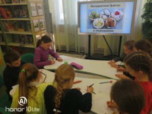 В библиотеке МБУ «ЦКР» 22 января состоялось мероприятие, посвященное сливочному мороженому на палочке в шоколадной глазури – эскимо. Праздник мороженого начался с небольшого путешествия в историю этого удивительного лакомства, ведь мороженое было не всегда. Библиотекарь Енина Л.Г. рассказала юным читателям о том, каким было мороженое в древние времена, откуда оно пришло в Европу, а затем в другие страны, а также ответила на другие интересные вопросы, связанные с самым главным лакомством всех детей России и мира. Ребята сами попытались догадаться, почему мороженое изначально было доступно только богатым людям, а также для чего применяли поваренную соль при массовом производстве этого десерта. Много секретов о любимом лакомстве узнали в этот день дети, в том числе и о полезных свойствах мороженого.